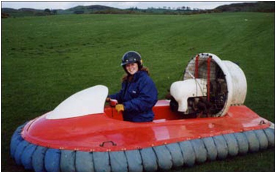 A vehicle capable of travelling over surfaces on a cushion of slow moving, high-pressure air. The air is ejected against the surface below and contained within a skirt. A propeller in the vertical plane used to provide the thrust, to move forward.